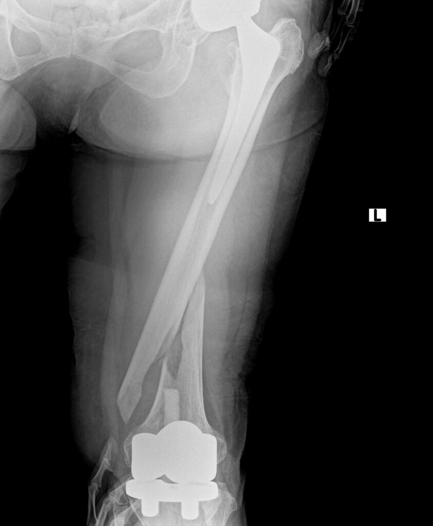 人工股関節と人工膝関節の間で螺旋状に骨折しています。