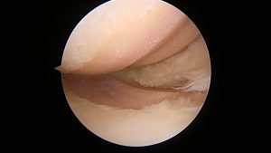 関節鏡で膝の中を確認すると、膝の内側の軟骨が消失しているのに対し、