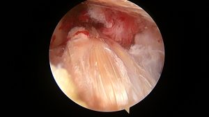 (下)画面の左上から右下にかけてあるべきACLは遺残組織のみとなっています。